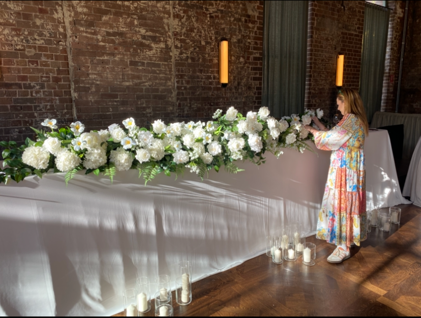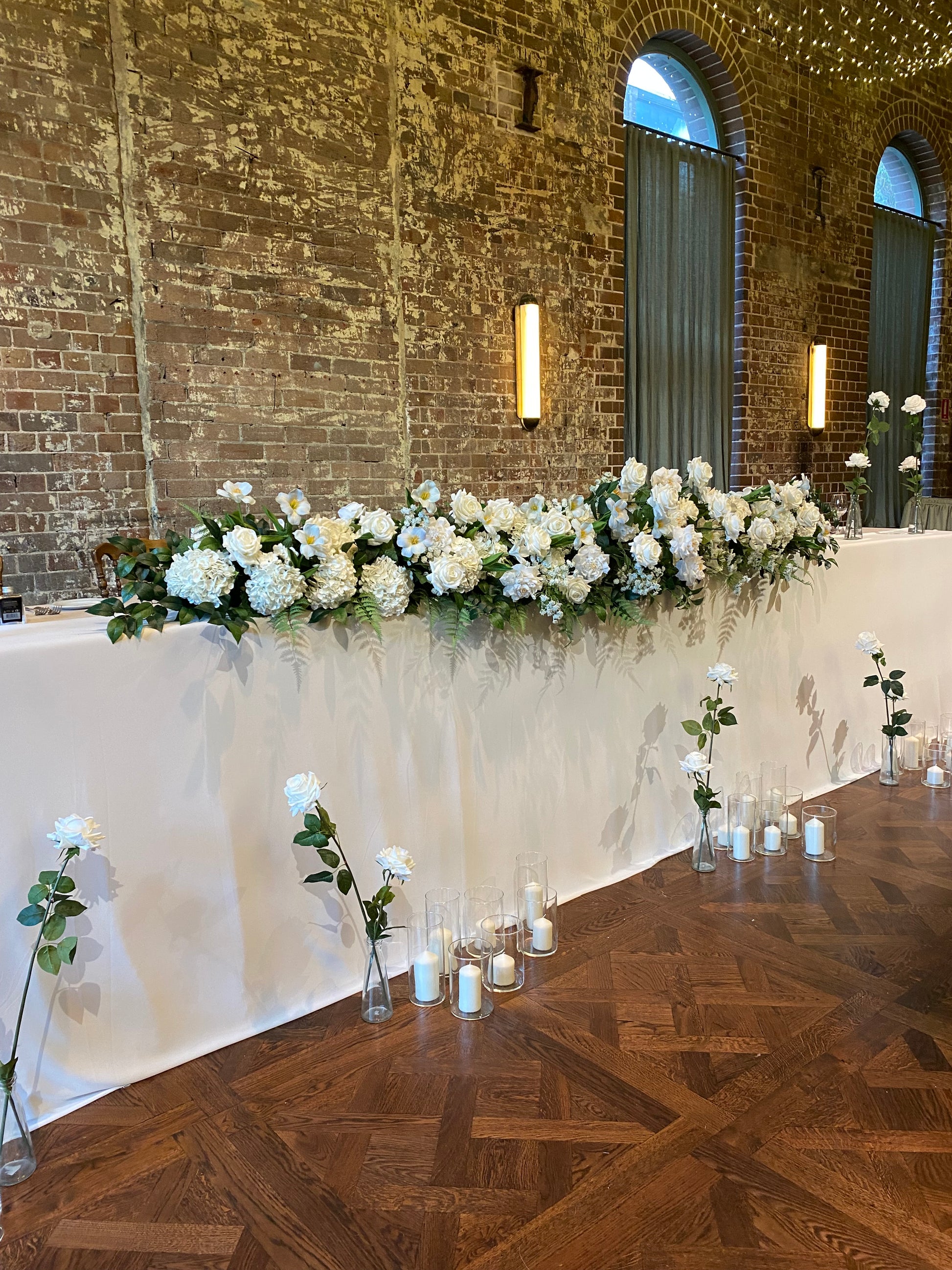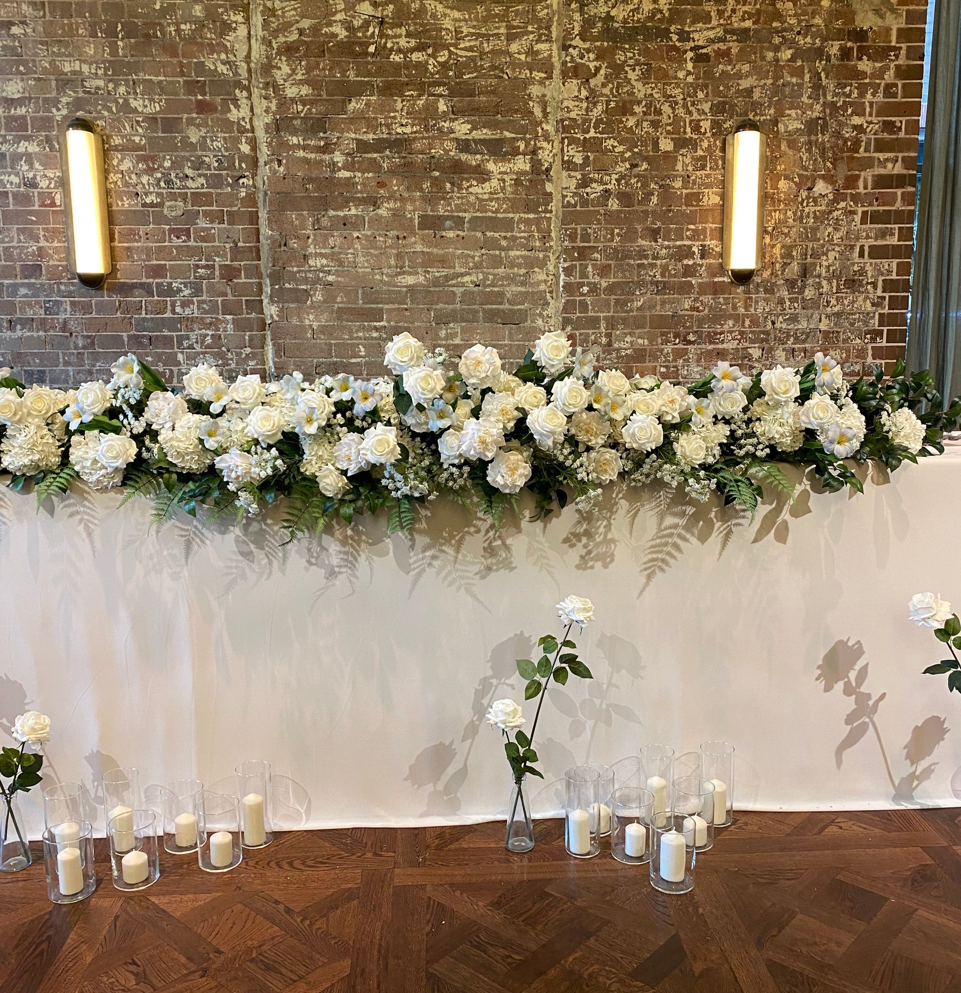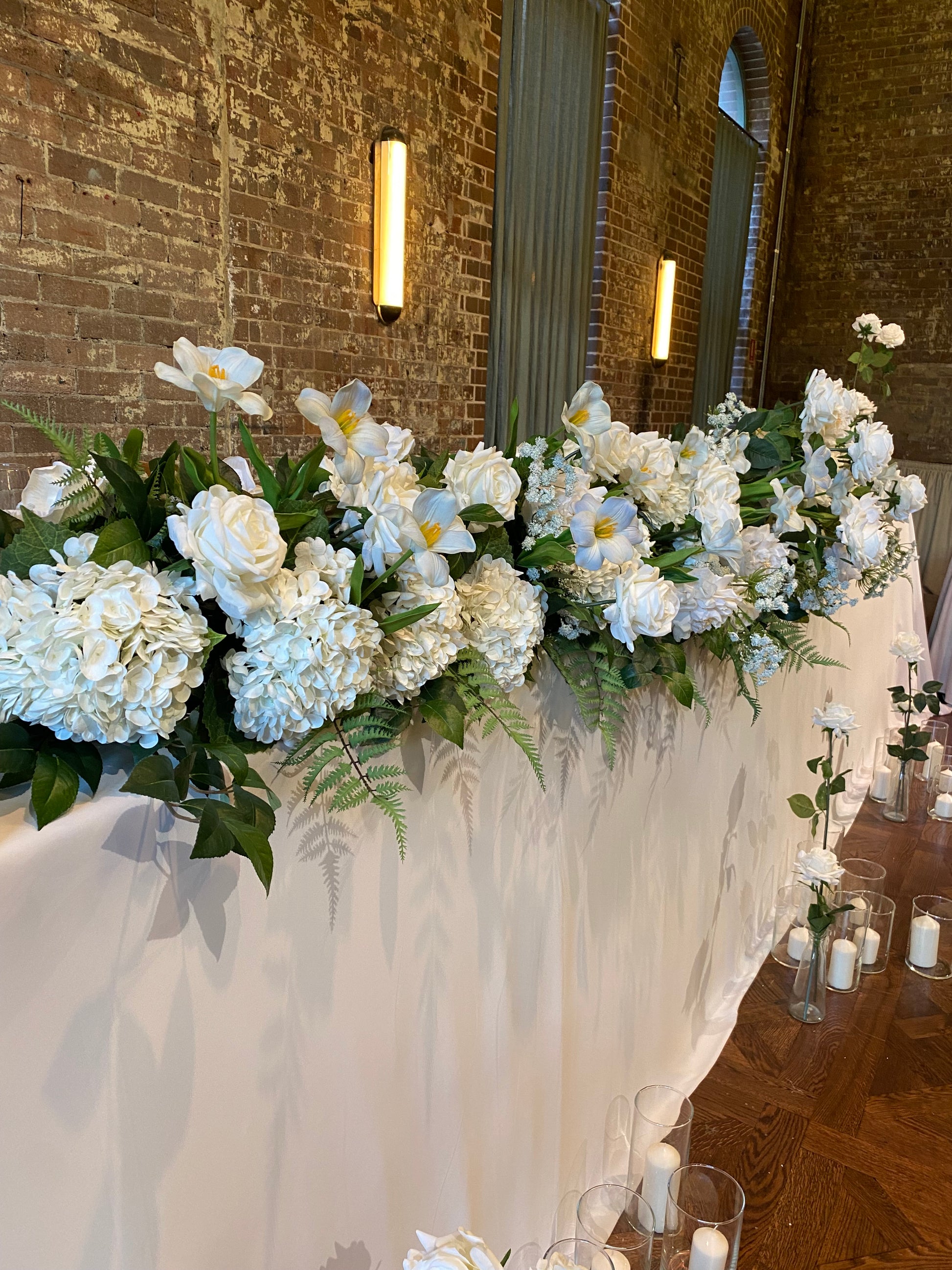 Introducing the breathtaking Wedding Main Table Flower Arrangement, An exquisite masterpiece that transcends mere floral arrangement to become a statement of unparalleled beauty. Crafted with real touch flowers, each petal of flowers is a testament to nature's perfection, meticulously preserved for everlasting allure. Back is filled with greenery and baby’s breath. Piece features 120 real touch flowers on the front.