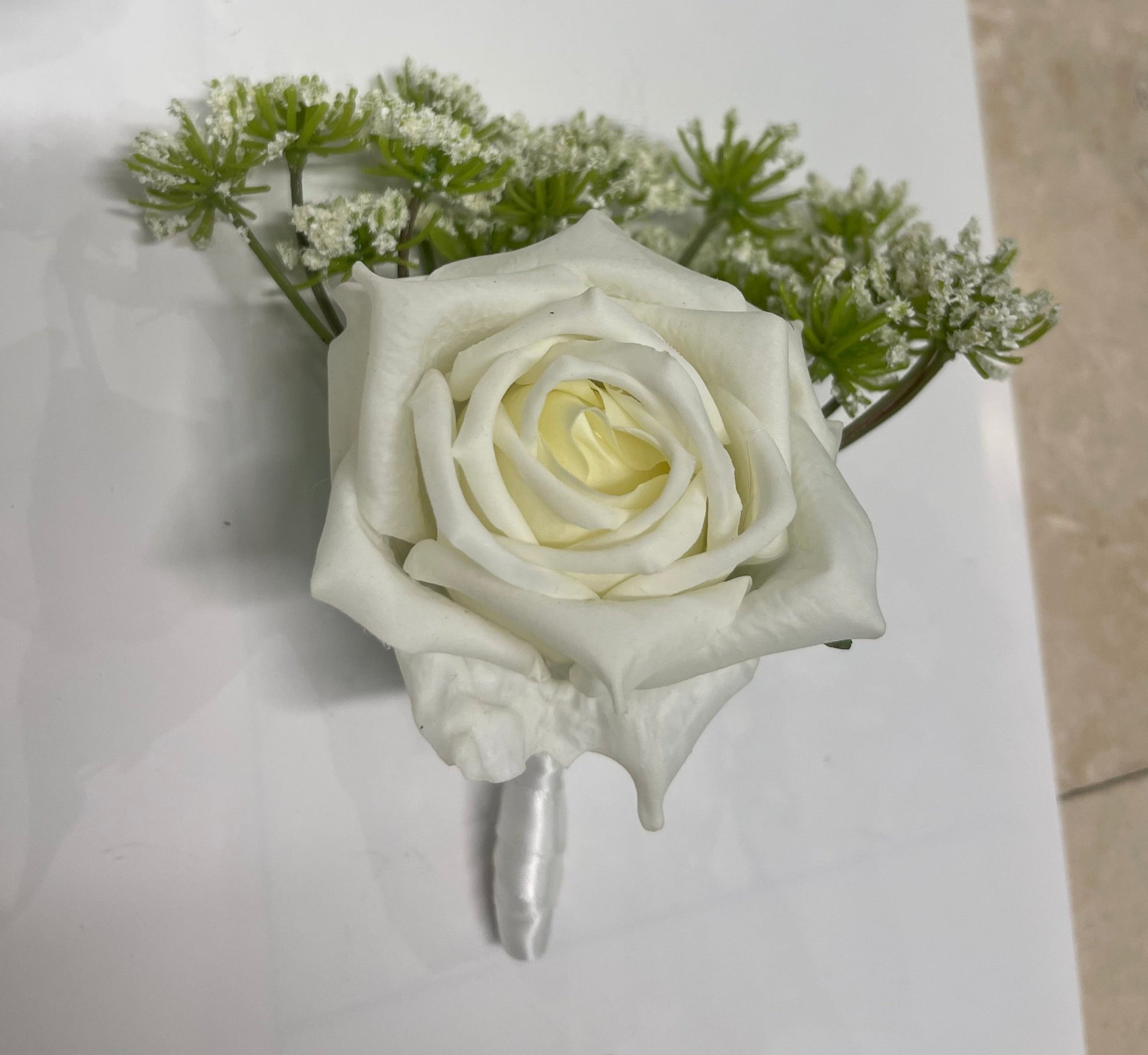 White Lola Rose with Queen Anne’s Lace Buttonhole